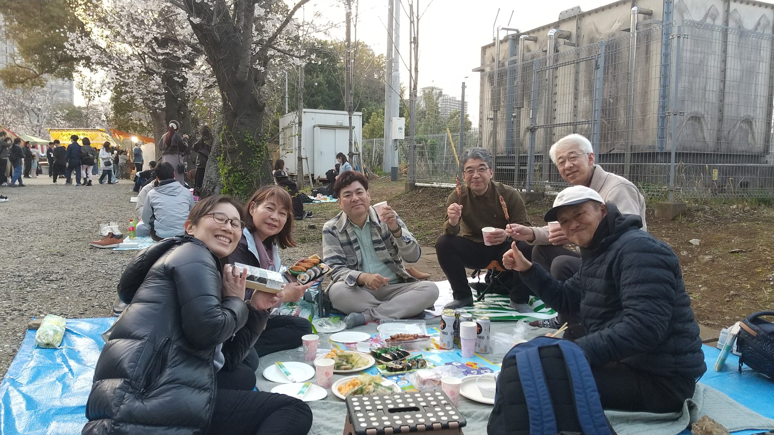 練習後は、大判レジャーシートを抱えて、夜のお花見を開催!